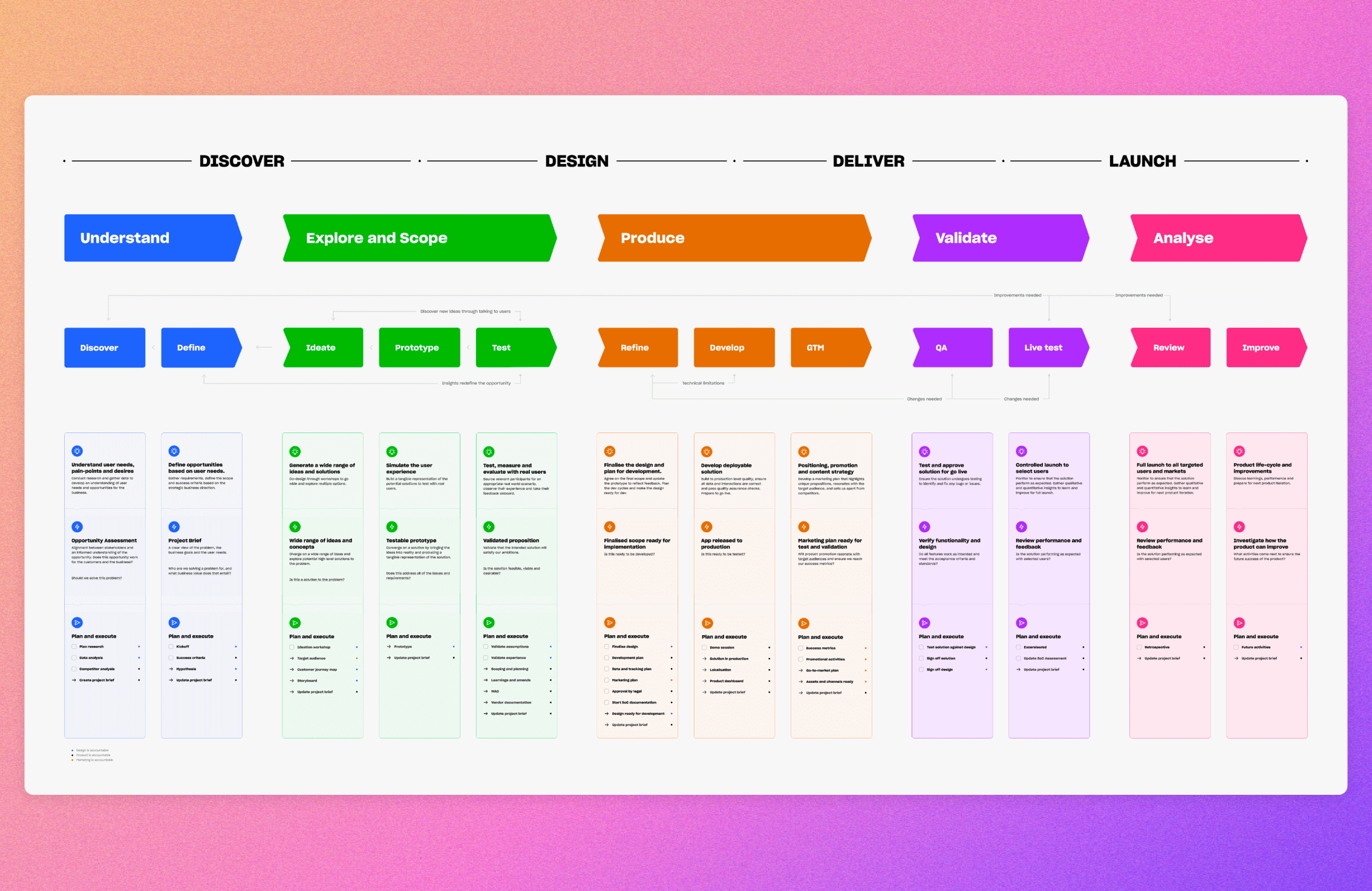 To address this, I initiated a series of design ceremonies aimed at fostering collaboration and alignment within the design team. These included critique sessions, skill-sharing workshops, “Friday Wins” showcases, and the creation of a shared Kanban board to visualise ongoing and upcoming work. These activities helped surface key gaps in collaboration and revealed the need for a unified design process across the organisation.